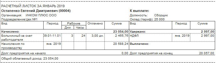 Оклад Остапенко Е.Д. составляет 25 000 руб. Январь 2019 года отработан не полностью: с 09 по 11 января сотрудник брал больничный.
