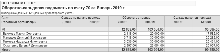 Сформируйте отчет "Оборотно-сальдовая ведомость по счету" 70 за январь 2019 года.