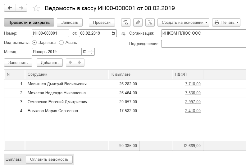 - Ведомость в кассу;