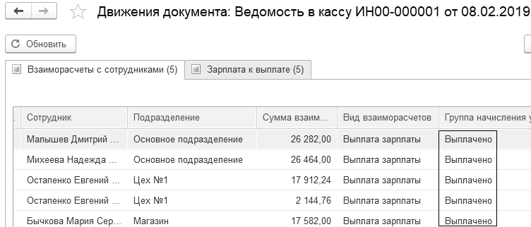 Проведенный документ "Ведомость в кассу" сформирует записи в регистр накопления "Взаиморасчеты с сотрудниками" по группе "Выплачено" (рис. 9.1.21). Таким образом, задолженность перед сотрудниками закрыта (напомним, что возникла она после проведения документа "Начисление зарплаты" регистром "Взаиморасчеты с сотрудниками" по группе "Начислено").