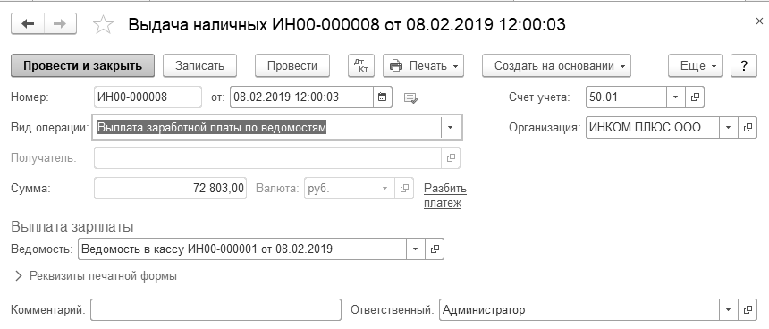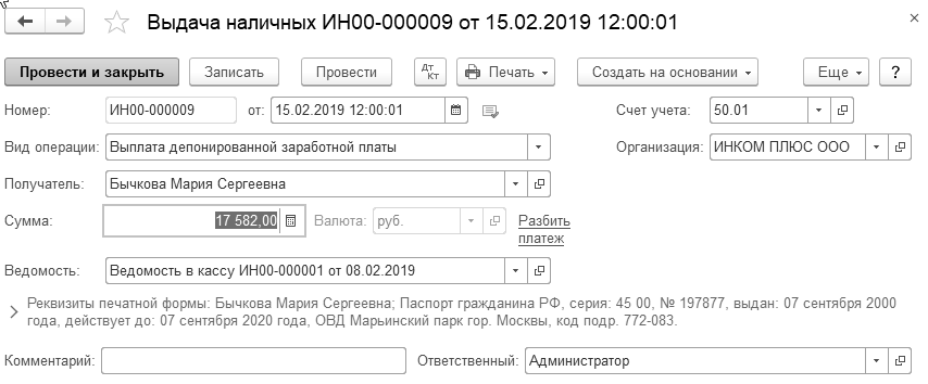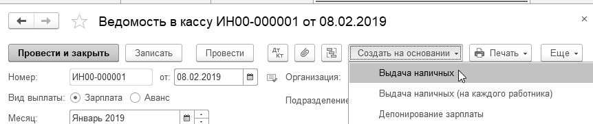 08.02.2019 года зарплата за январь выплачена по платежной ведомости через кассу всем, кроме Бычковой М.С. Зарплата Бычковой М.С. депонирована. Создайте документ "Ведомость в кассу", и на его основании документы "Депонирование зарплаты" и "Выдача наличных".
