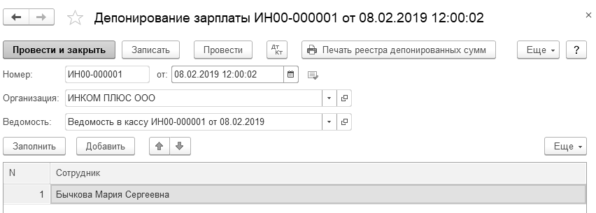Документ "Депонирование зарплаты" заполняется по кнопке "Заполнить", и далее, табличная часть документа редактируется.