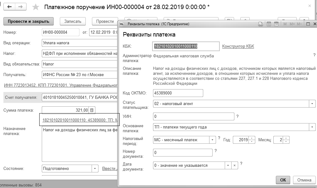 11.02.2019 года подготовьте платежное поручение в федеральный бюджет по НДФЛ за январь с больничного листа (Остапенко Е.Д.) в сумме 321 руб. На основании платежного поручения на эту же дату создайте документ "Списание с расчетного счета".