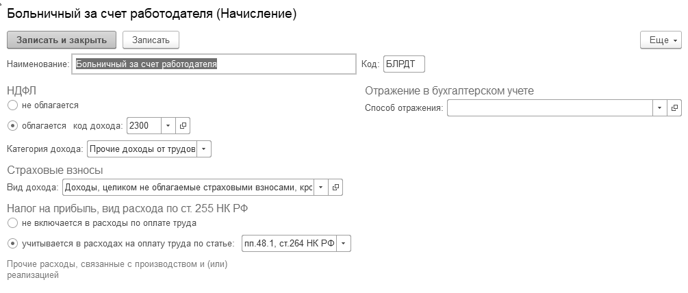 На рисунке 9.1.6 реквизит "Способ отражения" в бухгалтерском учете остался не заполненным. Это означает, что будет в документ подставляться тот затратный счет, который указан в документе "Прием на работу".
