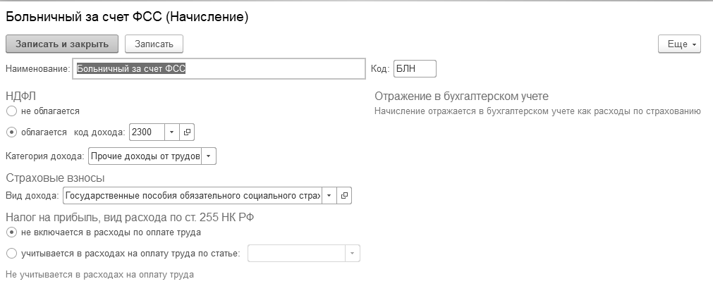 - БЛН – больничный за счет ФСС РФ (рис. 9.1.7).