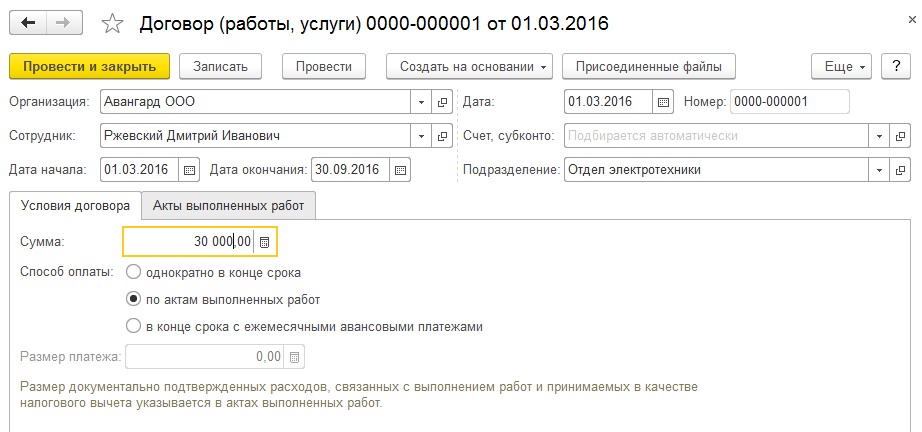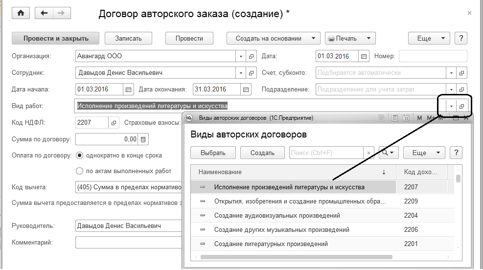 Если в договоре подряда либо авторском договоре указана оплата по актам, то перед расчетом заработной платы в том месяце, в котором следует произвести оплату сотруднику, следует ввести "Акт приемки выполненных работ ".
