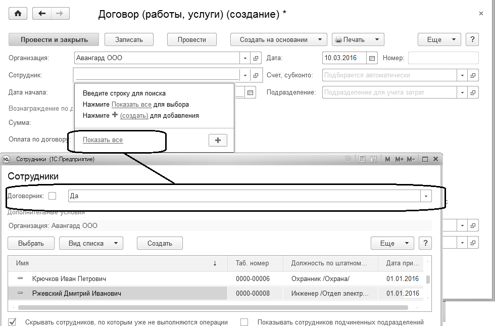 Проведем документ. Обратите внимание, что у сотрудника, с которым заключен только договор подряда, не указывается подразделение и должность в справочнике сотрудники, поскольку это условия трудового договора.