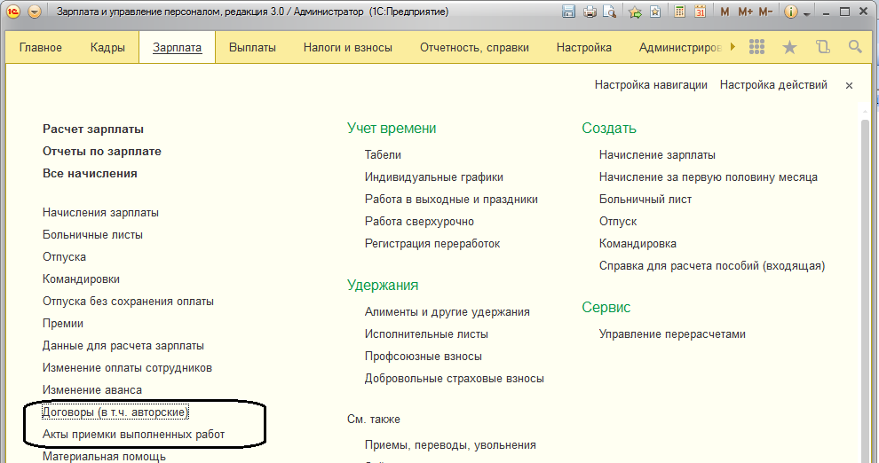 Доступ к документам по подрядным договорам осуществляется из раздела "Зарплата / Договоры (работы, услуги, авторский заказ)". Также договор можно ввести на основании справочника "Сотрудники".