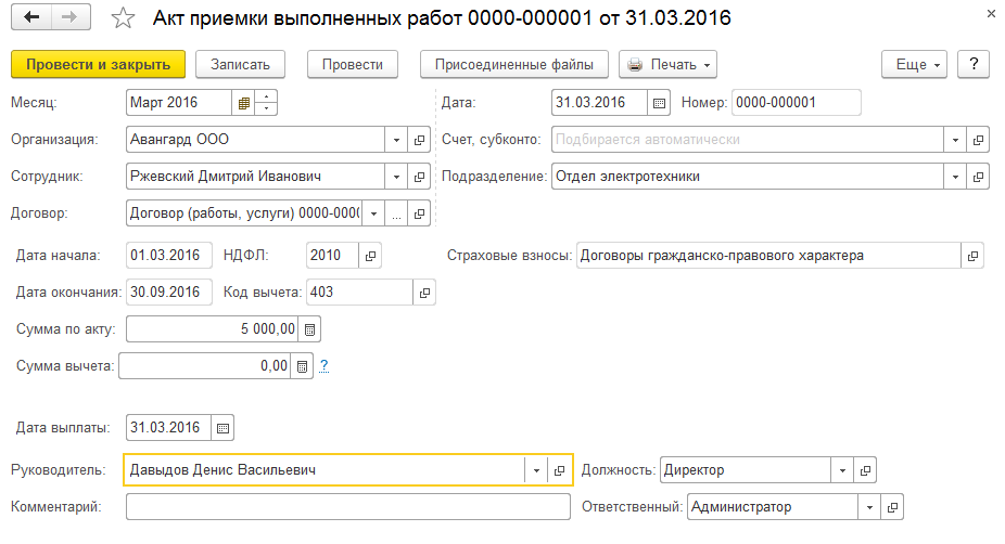 В расчетный отдел ООО "Авангард" поступил акт выполнения работ по договору подряда за март, заключенному с сотрудником Ржевским Д.И. на сумму 5000 руб. Создадим из раздела "Зарплата/ Договоры (в т.ч. авторские)" акт приемки выполненных работ и заполним его следующим образом: