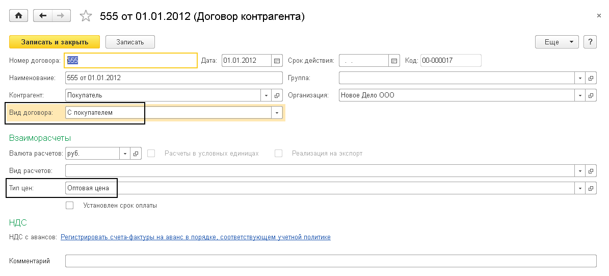 Принципиальным отличием является вид договора с контрагентом, который может быть «с покупателем» или «с комиссионером». Возвращаясь к расчетам, в частности, к договорам контрагентов, следует обратить внимание на поле «Тип цен». При рассмотрении соответствующего справочника в разделе, посвященном выпуску продукции, было указано, что в справочнике «Тип цен» помимо названия указывается порядок учета НДС. Что это дает?