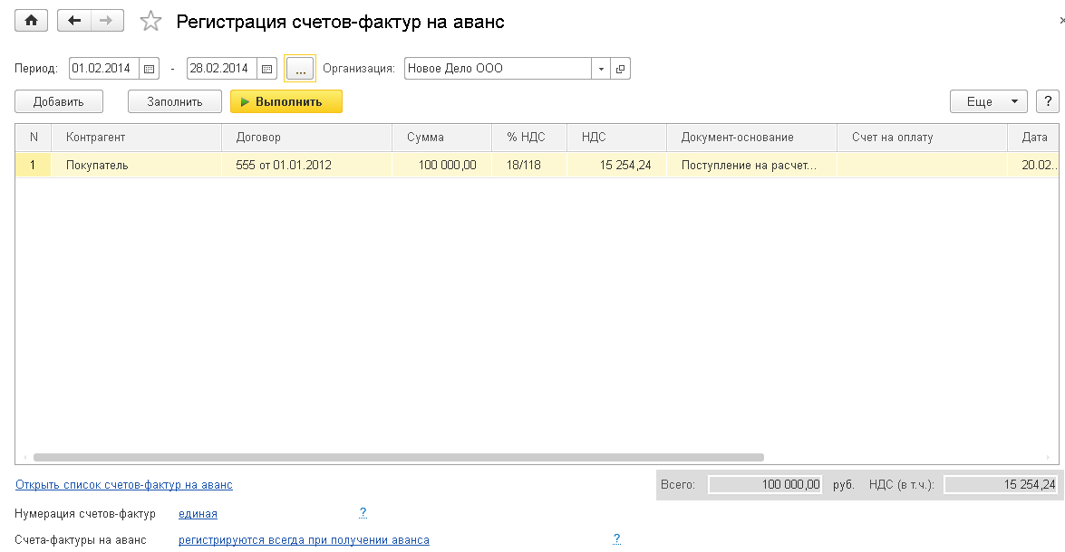 Данная обработка просматривает все поступления денежных средств за выбранный пользователем период и определяет, какие из них можно отнести к полученным авансам, и выводит список в табличную часть. По кнопке «Выполнить» программа выписывает счета-фактуры на аванс автоматически. Отличительной особенностью таких документов является наличие префикса в виде буквы «А», что означает, что данный счет-фактура выписан на аванс. Данный префикс позволяет вести отдельную сквозную нумерацию счетов-фактур выданных покупателям и счетов-фактур, выписанных на аванс. Таким образом, регистрацию счетов-фактур на аванс можно отнести не к операционной (ежедневной) деятельности, а к регламентной, то есть выполнять ее раз в месяц.