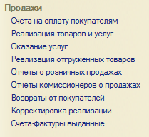 Основной документооборот по реализации продукции, товаров и услуг находится на панели разделов «Продажи.