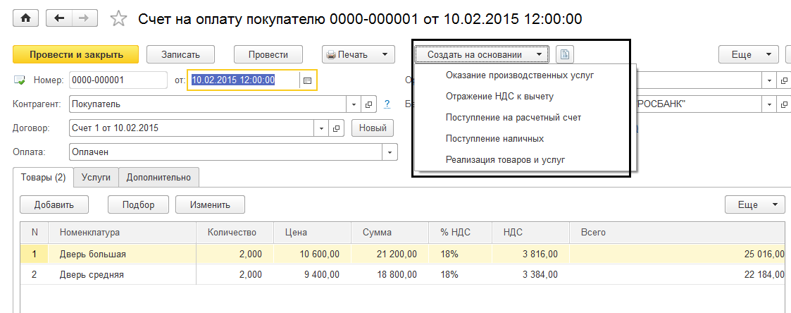 При отражении операций по реализации имеется возможность в программе предварительно выставить счет на оплату покупателю. На основании данного счета на оплату автоматически сформировать документы по поступлению наличных или безналичных денежных средств, накладную ТОРГ-12 или акт выполненных работ, а также счет-фактуру.