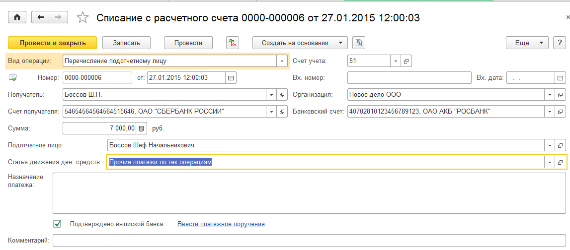 3. 27 января перечислить безналичным путем на карточный счет сотрудника денежные средства в подотчет также в размере 7 000 руб.