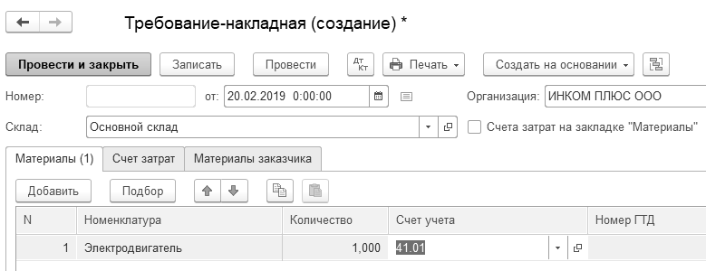 Цель – сформировать отчет "Оборотно-сальдовая ведомость по счету" 41.01 и создать документ "Требование-накладная". Расход нормируется, т. е. включается в состав прочих расходов в пределах 1% выручки без НДС.