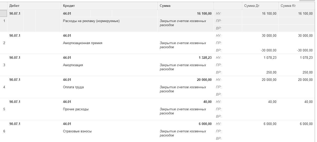 Документ сформирует бухгалтерские и налоговые записи по списанию торговых затрат в Д 90.07.1 К 44.01 (расходы на рекламу (нормируемые)). Движение документа "Регламентная операция" по операции "Закрытие счета 44 "Издержки обращения"" представлены на рисунке 19.5.