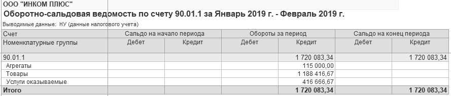 Как посчитана выручка за январь – февраль? Сформируйте оборотно-сальдовую ведомость по счету 90.01.1, но в панели настроек снимите флаг "БУ (данные бухгалтерского учета)" и установите флаг "НУ (данные налогового учета)". Уберите детализацию по номенклатуре и ставкам НДС. Отчет показан на рисунке 19.6.
