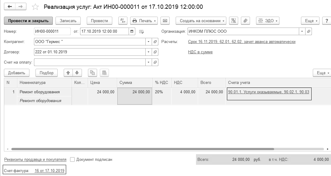17.10.2019 года создайте документ "Реализация (акт, накладная)" для ООО "Гермес" по договору № 222 от 01.10.2019 г., в котором отразите услугу "Ремонт оборудования" в сумме 24 000 руб., в т. ч. НДС 20% (4 000 руб.). Выписан счет-фактура от 17.10.2019 года.