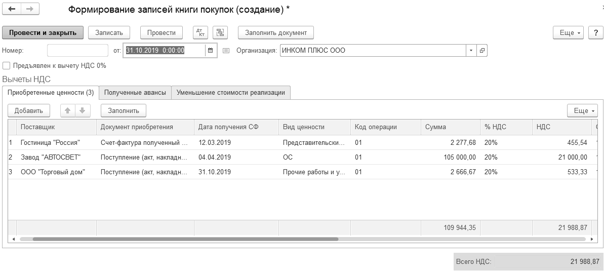 Создайте документ "Формирование записей книги покупок" от 31.10.2019 года.