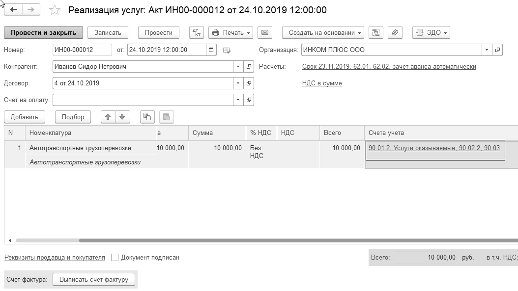 24.10.2019 года создайте документ "Реализация (акт, накладная)" для физического лица Иванова Сидора Петровича по договору № 4 от 24.10.2019 года, в котором отразите услугу "Автотранспортные грузоперевозки" в сумме 10 000 руб.