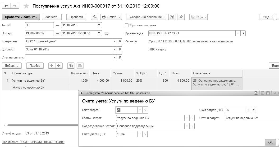 31.10.2019 года ООО "Торговый дом" оказало организации "ИНКОМ ПЛЮС" услуги по ведению бухгалтерского учета в сумме 4 800 руб. (НДС 20% в т. ч.), которые отнесены на счет 26, подразделение – "Основное подразделение", статья затрат – "Услуги по ведению учета". Договор № 33 от 01.10.2019 года.