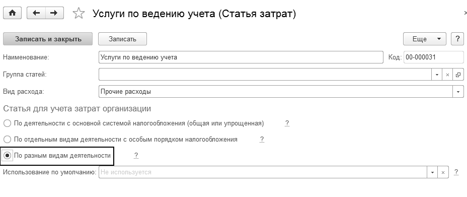 Вид операции "Услуги (акт)". В справочнике "Номенклатура" для элемента "Услуги по ведению БУ" установлен вид номенклатуры "Услуга". Для счета 26 надо указать статью затрат – "Услуги по ведению учета" в табличной части документа. Обратите внимание, что услуга используется и общим режимом налогообложения, и ЕНВД. Поэтому, при заполнении элемента статьи затрат установите флаг – "По разным видам деятельности" (рис. 24.2.5).