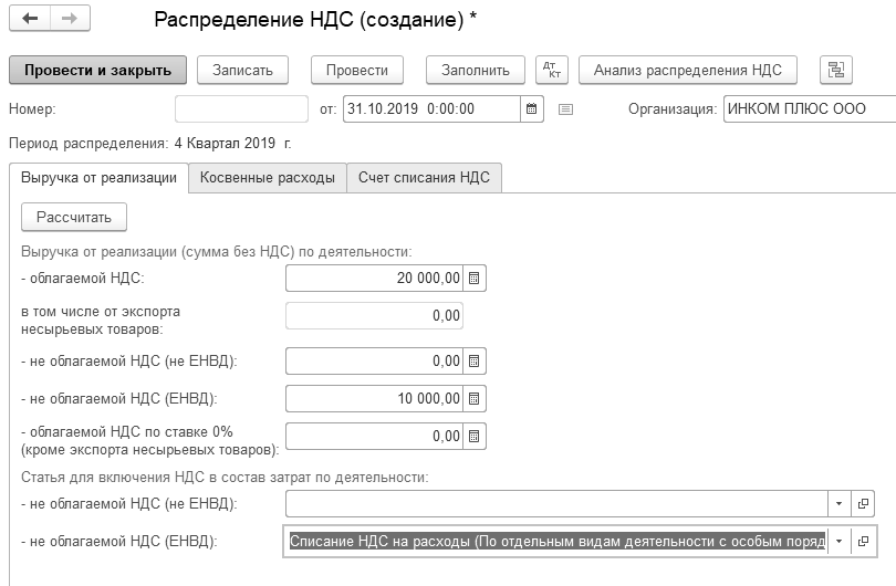 Регламентные операции НДС/Создать/Распределение НДС")
