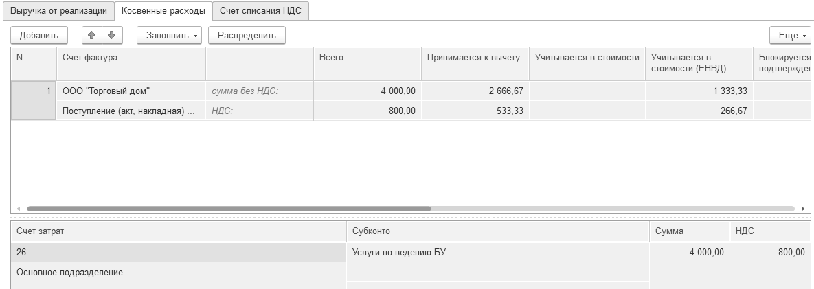 31.10.2019 года ООО "Торговый дом" оказало организации "ИНКОМ ПЛЮС" услуги по ведению учета в сумме 4 800 руб. (в т. ч. НДС 20%), которые отнесены на счет 26, подразделение – "Основное подразделение", статья затрат – "Услуги по ведению учета". Договор № 33 от 01.10.2019 года. Поставщиком предъявлен счет-фактура № 33 и акт № 33 от 31.10.2019 года (рис. 24.2.4). НДС поставщика этой услуги придется распределять.