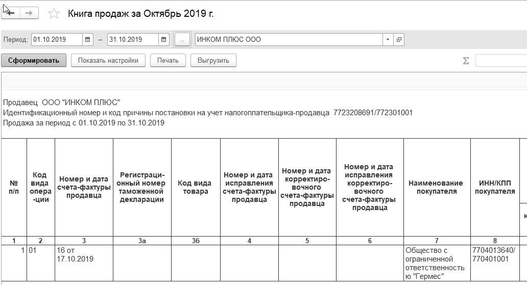 Создайте отчет "Книга продаж" за октябрь 2019 года.