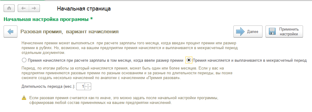 Позволяет автоматически добавить требуемые виды расчета по разовой премии в план видов расчета "Начисления". Отдельной настройки программы для этого нет, если премию потребовалось добавить впоследствии, пользователь вручную создает подобный вид расчета в списке начислений.