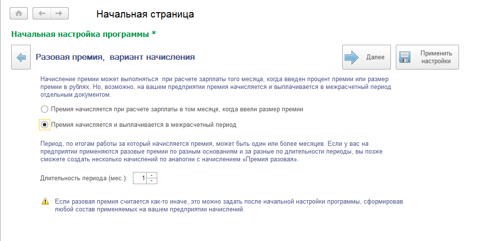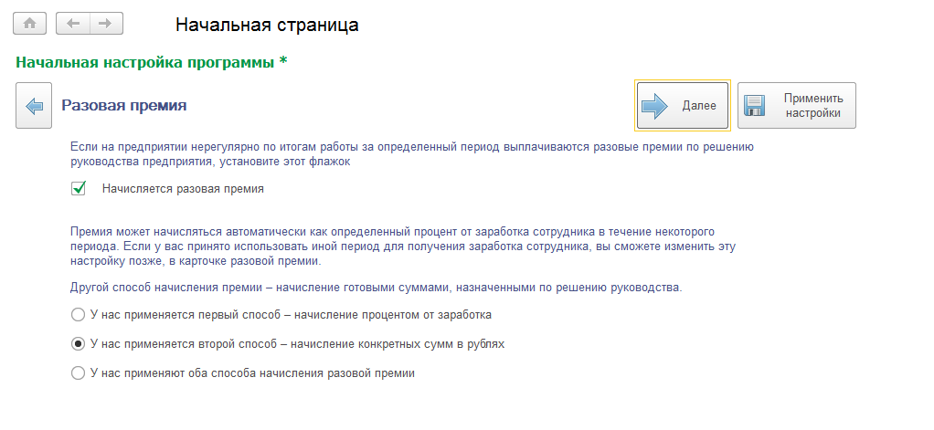 Позволяет автоматически добавить требуемые виды расчета по разовой премии в план видов расчета "Начисления". Отдельной настройки программы для этого нет, если премию потребовалось добавить впоследствии, пользователь вручную создает подобный вид расчета в списке начислений.