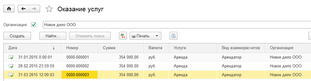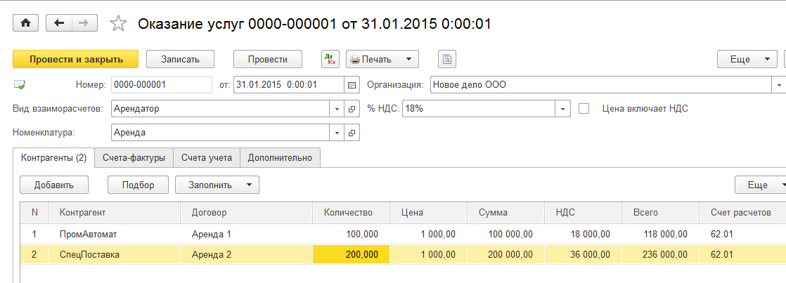 Документом «Оказание услуг» можно отразить факт оказания одной услуги, но массово многим контрагентам и массово на всех выписать акты выполненных работ и счета-фактуры. Например, организация является провайдером и предоставляет населению услуги интернета.