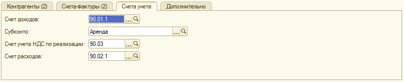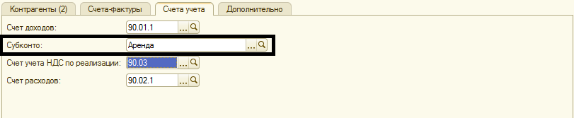 На закладке «Счета учета» определяются счета учета доходов и расходов от реализации услуги. И обязательно аналитика к 90 счету субконто «Номенклатурные группы» определяется как вид деятельности организации, по которой отражается операция.