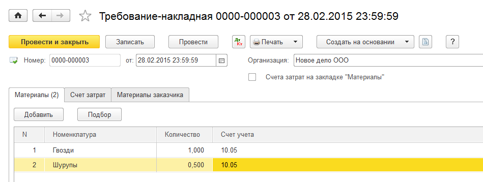1. 28 февраля отразить списание материальных затрат для оказания услуги по индивидуальному заказу документом «Требование-накладная»: