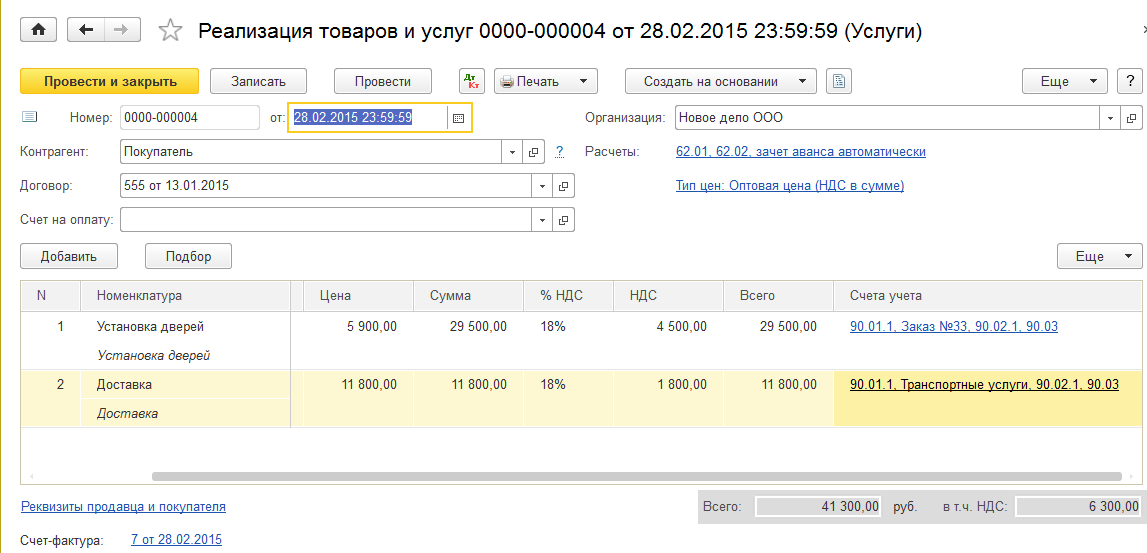 Документом «Реализация товаров и услуг» можно отразить оказание нескольких разных услуг, но одному контрагенту, например, реализация дверей, окон и плюс к этому доставку, установку и т.д.