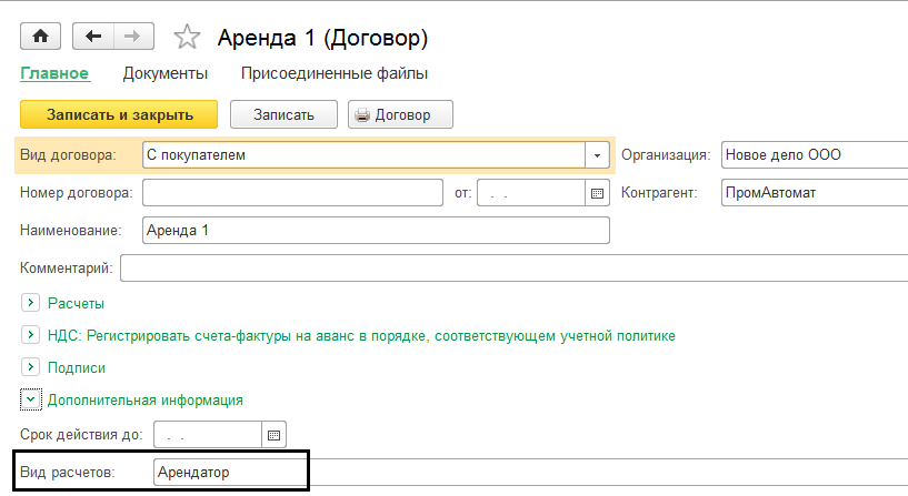 В справочник «Контрагенты» контрагентам «СпецПоставка» и «ПромАвтомат» добавить новые договора «Аренда» с покупателем и установить вид взаиморасчетов «Арендатор».