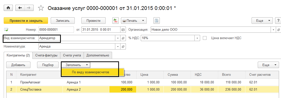 Основным преимуществом документа «Оказание услуг» является возможность его автоматического заполнения по виду взаиморасчетов. Реквизит «Вид взаиморасчетов» есть в договоре с контрагентом, это некий признак, по которому можно объединить контрагентов. Например, организация сдает в аренду помещения и в конце каждого месяца необходимо всем свои арендаторам выставить акты и счета-фактуры. Вот признак «Арендатор» и будет в нашем случае являться видом взаиморасчетов.