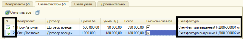 На закладке «Счета-фактуры», устанавливается признак «Выписан счет-фактура» напротив тех контрагентов, кому необходимо выставить счета-фактуры.