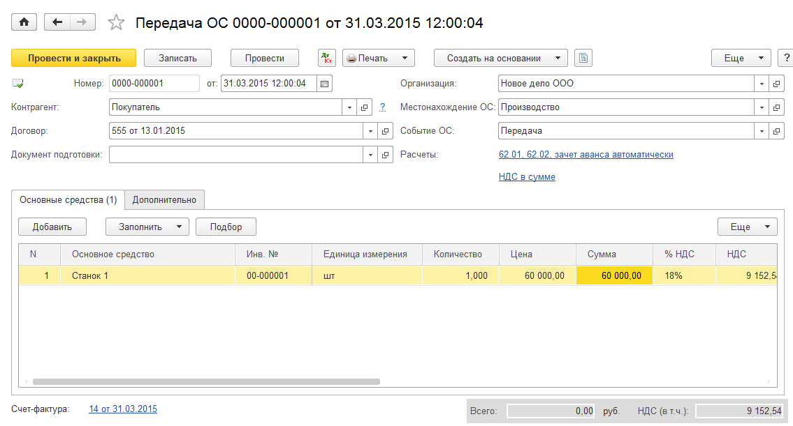 31 марта отразите реализацию ОС «Станок-1» стоимостью 60 000 руб. документом «Передача ОС».