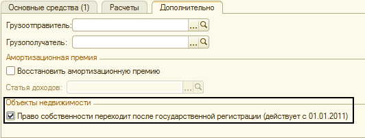 При проведении документ начисляет амортизацию за месяц выбытия, списываются суммы начисленной амортизации, рассчитывается сумма восстановленной амортизационной премии, которая была ранее включена в затраты. А также при реализации объекта в учете отражается задолженность по взаиморасчетам.