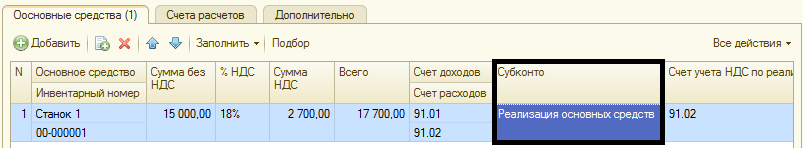 В табличной части документа выбирается объект основных средств, указывается сумма реализации и ставка НДС, счета учета доходов и расходов и НДС.