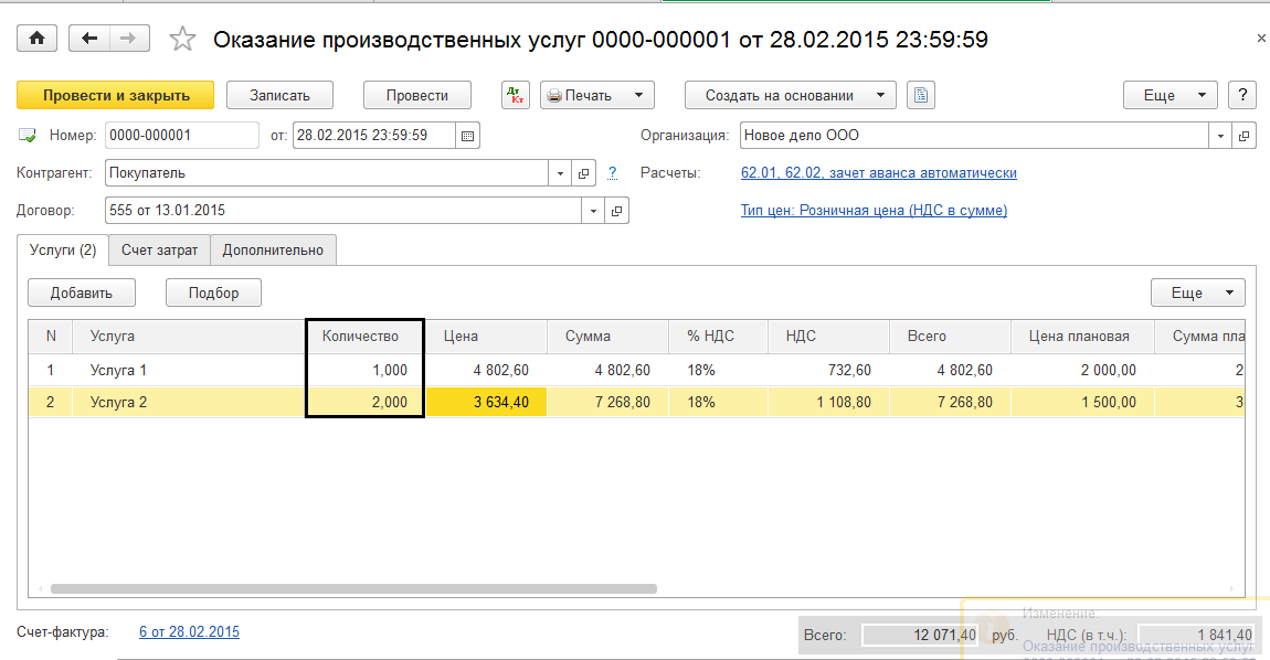 В случае, если оказываемые услуги относятся к одному из основных видов деятельности и имеют фактическую себестоимость, то их реализация отражается с помощью документа «Оказание производственных услуг».