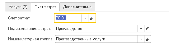 На закладке «Услуги» указываются оказанные услуги, количество и плановая стоимость. На закладке «Счет учета затрат» указывается с какого счета затрат списывается оказанная услуга в разрезе какой номенклатурной группы. Важно что для дальнейшего расчета фактической себестоимости оказанной услуги необходимо, чтобы услуга, указанная на закладке «Услуги», включалась в состав номенклатурной группы, указанной на закладке «Счета учета затрат».