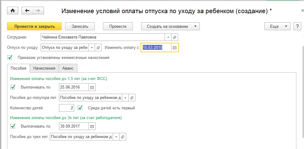 Сотрудница Чайкина Елизавета Павловна возвращается из отпуска по уходу за ребенком и будет работать НЕ полный рабочий день. Т.к. на момент возвращения на работу детям еще не исполнилось 1.5 года сотруднику должно выплачиваться пособие по уходу за ребенком.