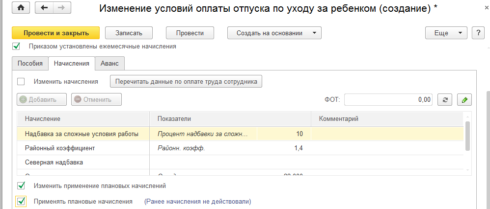 Оформляем документ "Изменение условий оплаты отпуска по уходу":