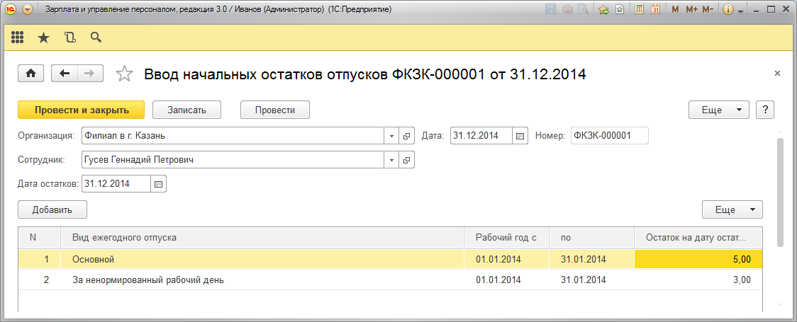 В документе Данные на начало эксплуатации введем сотруднику право на отпуск и остатки отпусков