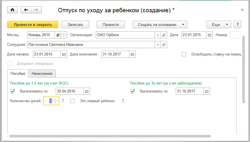 Сотрудница Ласточкина Светлана Ивановнауходит в отпуск по уходу за ребенком до 3-х лет на период с 25.01.15 по 31.10.2017. У сотрудницы родился один ребенок. Организация является первым местом работы сотрудницы.