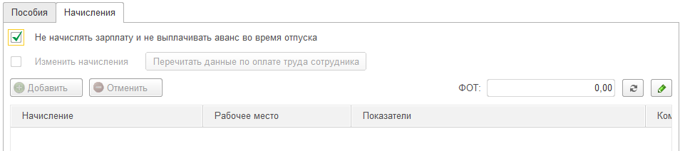 На закладке "начисления "установлен признак "не начислять зарплату и не выплачивать аванс во время отпуска"