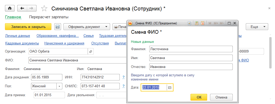 В печатных формах будет выводится фамилия в соответствии с датой формирования документа: