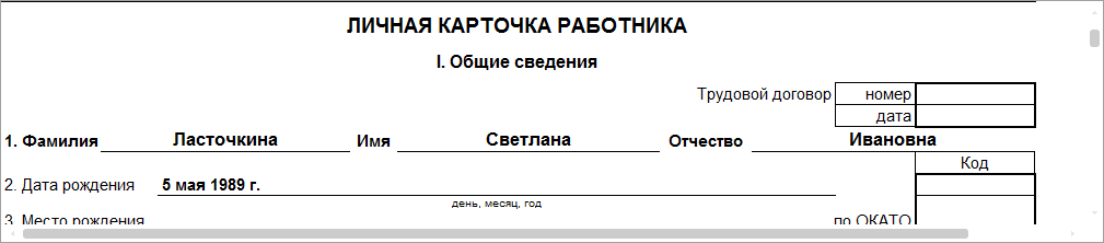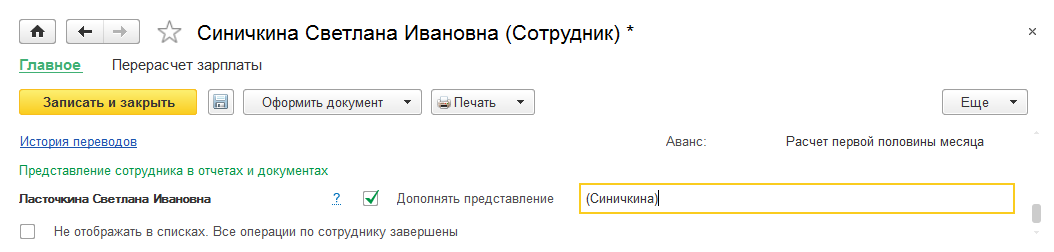 В разделе "Представление сотрудника в отчетах и документах" дополним представление